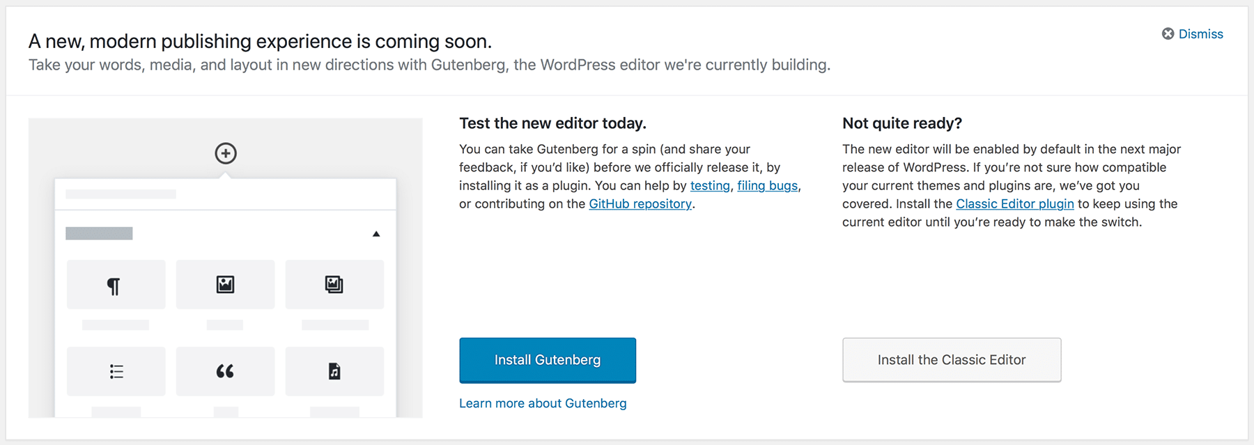 If you’ve opened up WordPress lately, you’ll likely have seen the above message waiting for you. The development team is eager to get users to try Gutenberg now to help get feedback and work out the kinks.