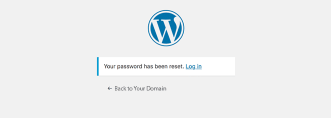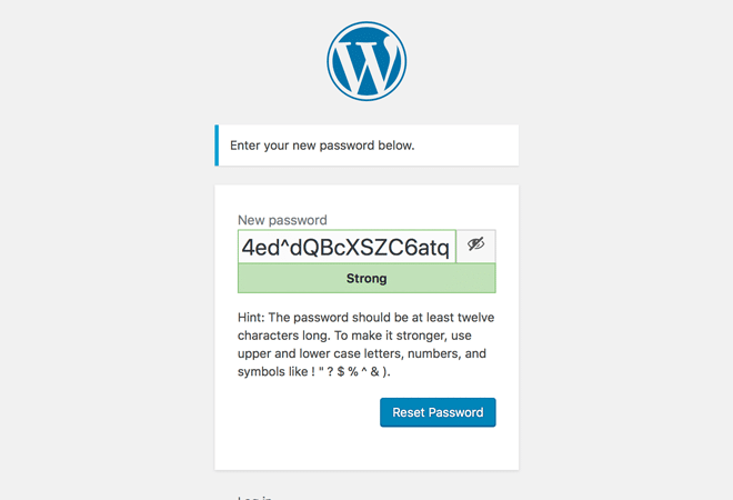 The user is returned to a WP login screen where a strong password has been randomly generated and pre-filled. This password can be used, or overwritten with a password of your choice—just make sure its a strong one.