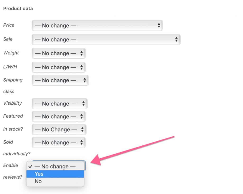 The bulk edit feature in WordPress is pretty great for changing things en masse on posts and products. I was surprised to find that there is no option for enabling reviews when bulk editing products. For e-commerce site owners with a lot of products this can be a problem.