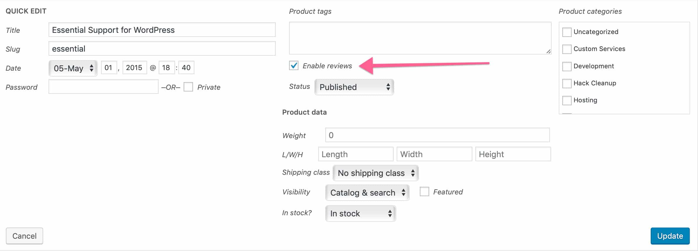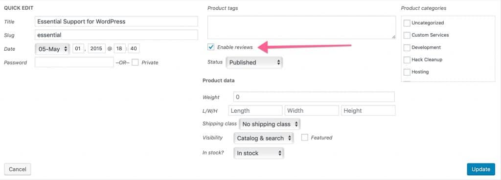 The bulk edit feature in WordPress is pretty great for changing things en masse on posts and products. I was surprised to find that there is no option for enabling reviews when bulk editing products. For e-commerce site owners with a lot of products this can be a problem.
