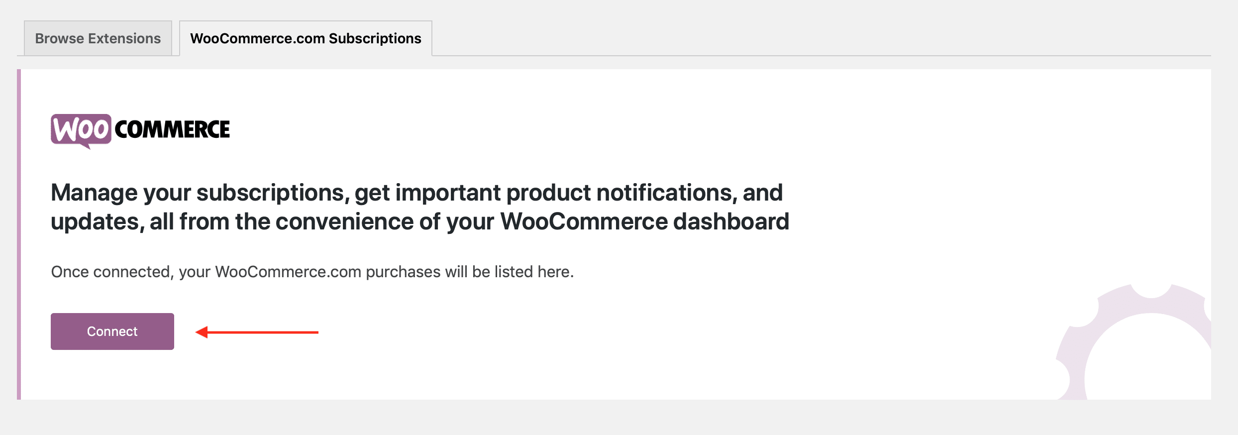 Connecting your site with your Woo account will allow you to install, enable and update your new extensions.