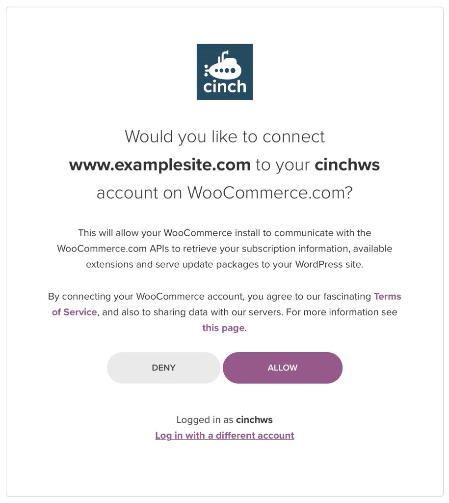 If you’re still logged into WooCommerce.com you’ll then see a dialog requesting access: