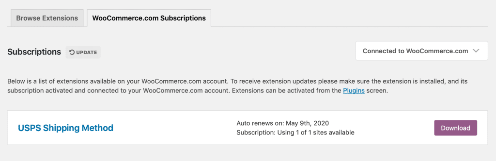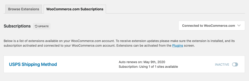 Once the extension is installed and activated, let’s do a second activation to make sure we get updates and notifications. Go back to WooCommerce -> Extensions -> WooCommerce.com Subscriptions. You should hopefully now have the ability to activate your new extension: