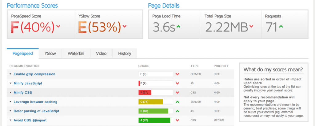 With all that power and potential, there are a few drawbacks, however. Most themes from ThemeForest require extra plugins and scripts to be installed. Often times they come bundled with a page builder such as Visual Composer, which adds even more scripts. All of these extra installs can cause performance issues if you’re not careful. A client recently came to us to help with performance and we found the site was loading 48!!! external javascript files and 19 stylesheets! Here’s a screenshot of a performance test we took at GTMetrix: