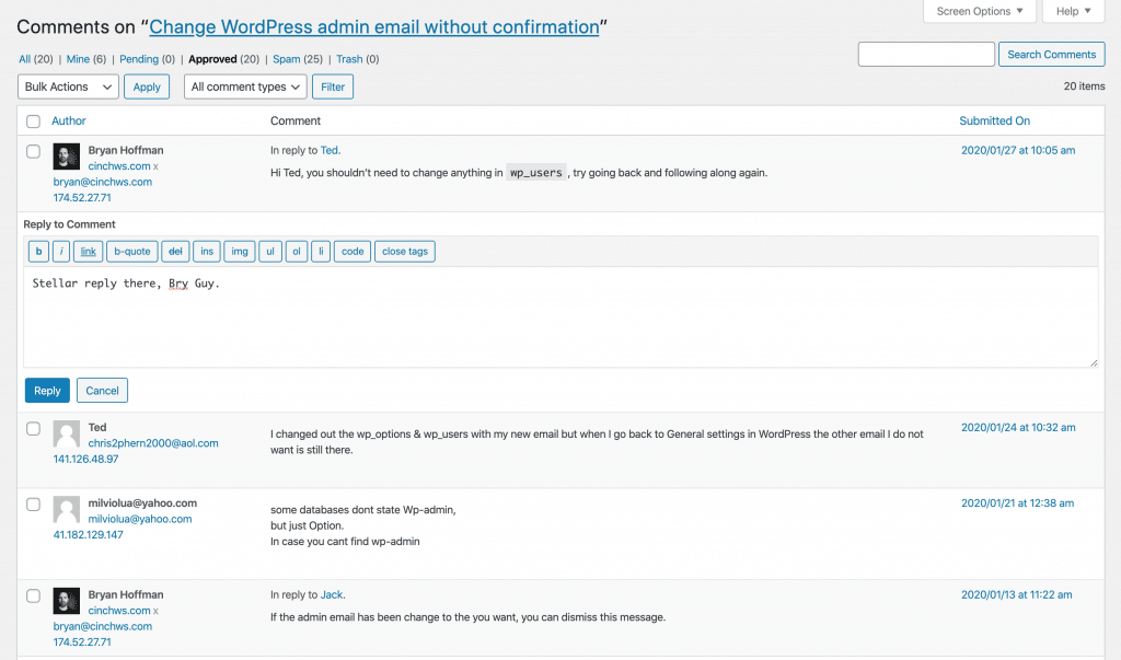 This will take you to a page listing all comments on that post. You’ll be able to moderate, edit, and reply as you always could: