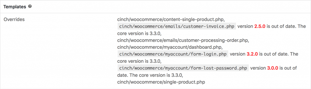 - Go to WooCommerce > System Status. Scroll to the very end of the page to the Templates section. There you will see a list of templates that have been overridden, as well as a warning message next to any outdated template: