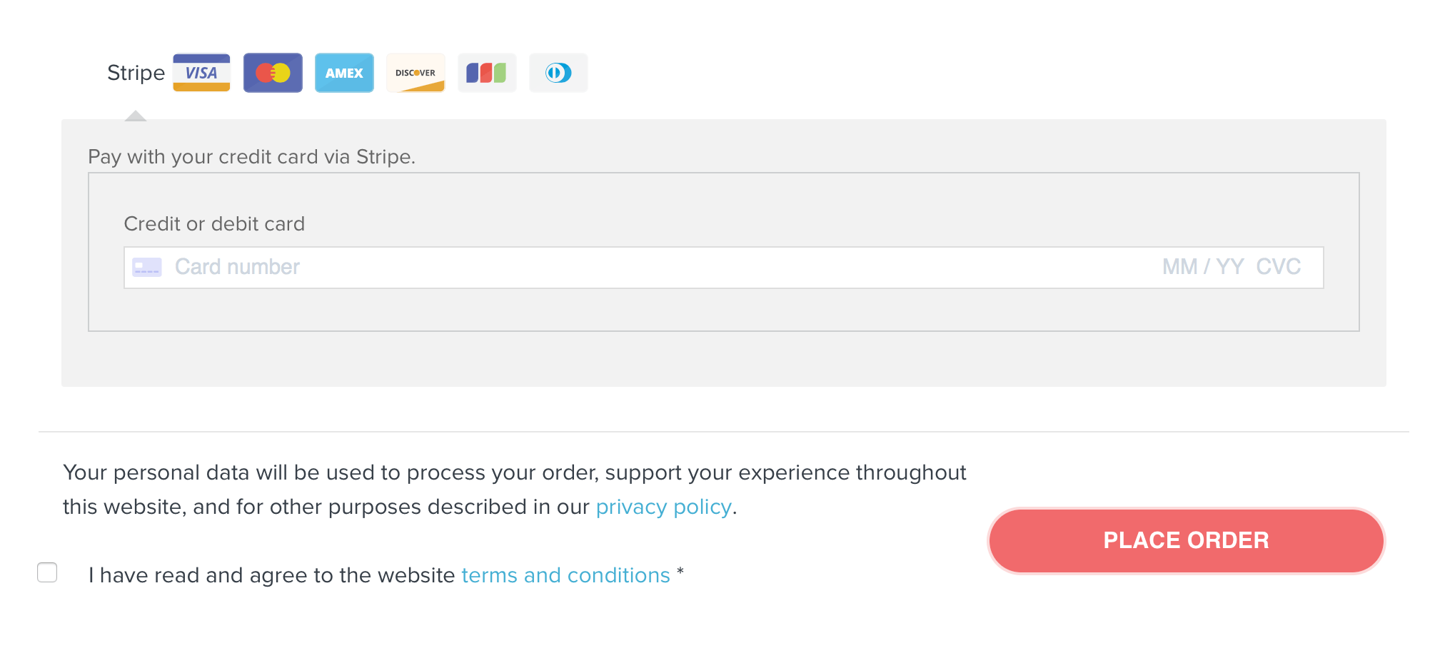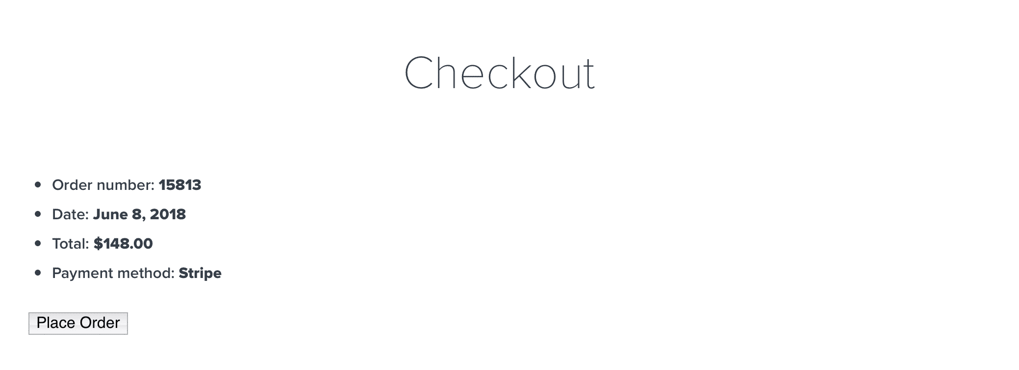 After clicking the Continue to Payment button, you’re redirected to this, an untitled page with an unstyled summary of the order and an ugly Place Order button: