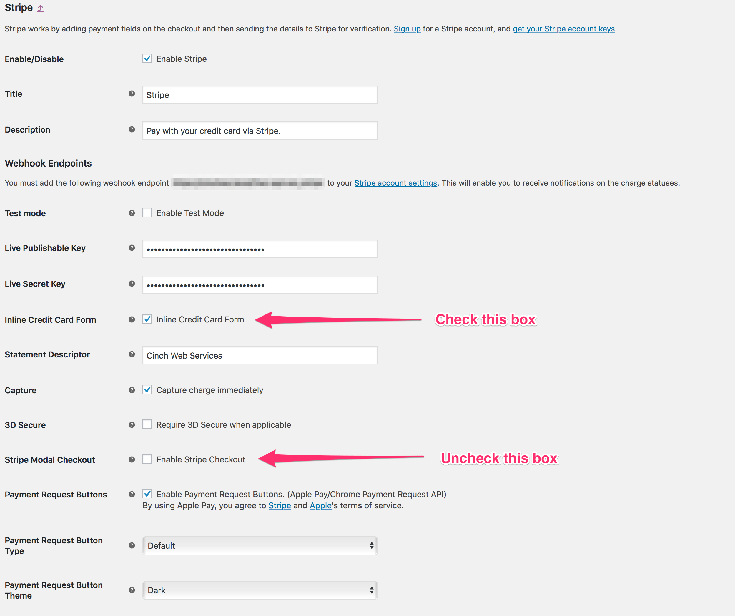 - Uncheck Enable Stripe Checkout