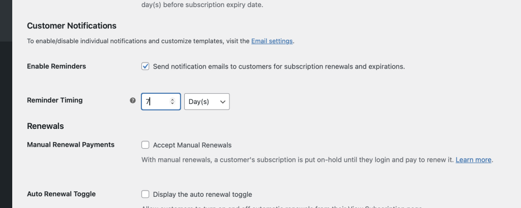 WooCommerce Subscriptions added a built-in pre-renewal reminder feature in version 7.7.0 (November 2024). It was enabled in the Email settings, but not fully turned on — there’s a second checkbox in the WooCommerce > Settings > Subscriptions screen that needs to be checked to actually send the notices. That part was skipped: