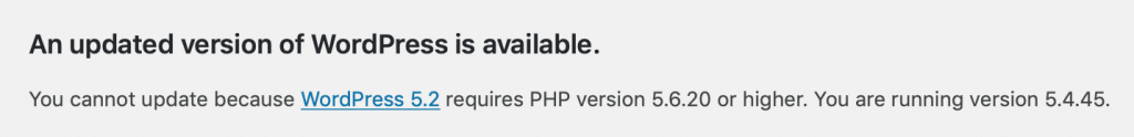 If you are running a version of PHP less than 5.6, WordPress will not allow you to update the site. From the update page, you will see this: